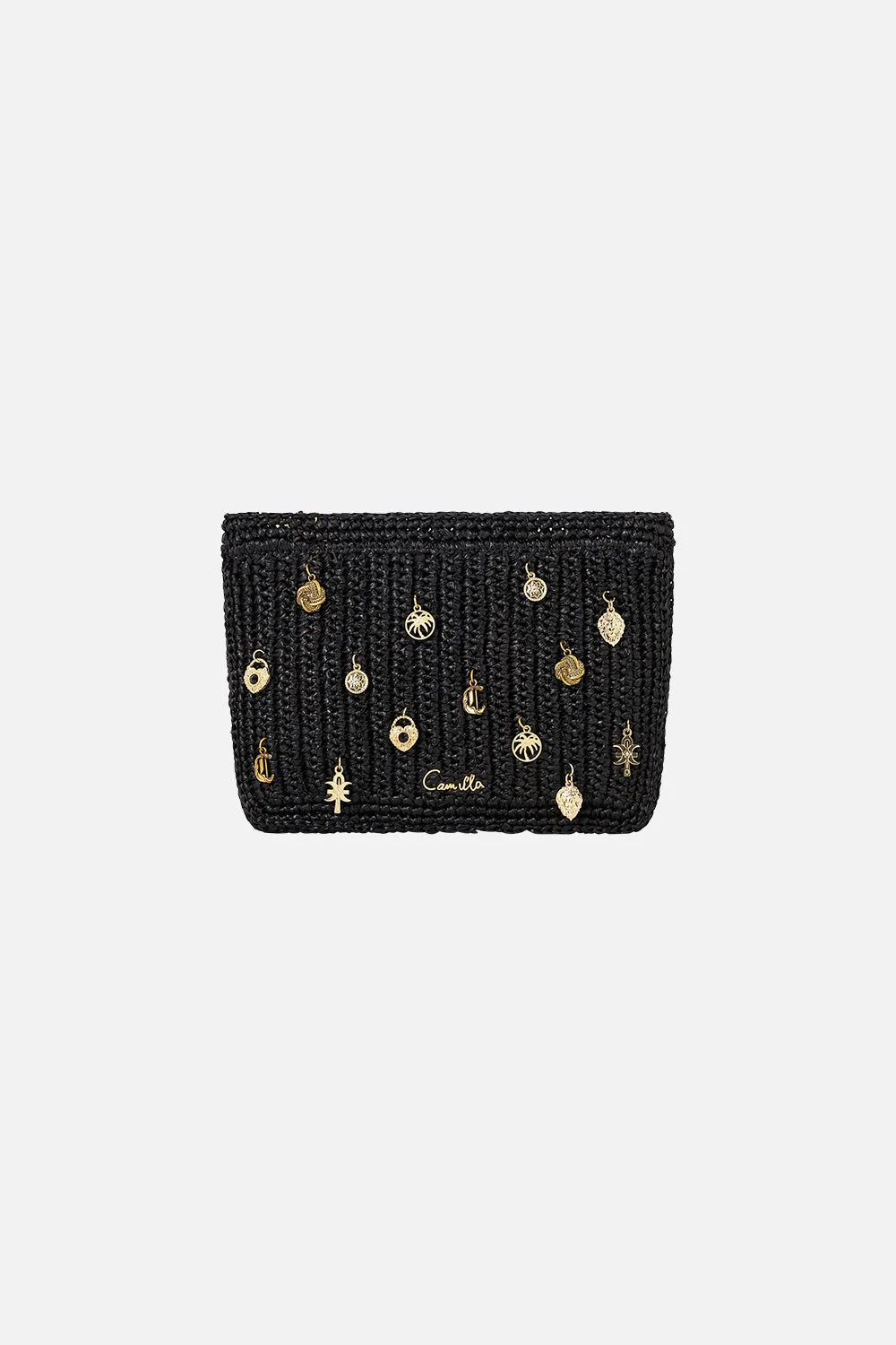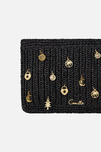 The Solid Black Raffia Clutch With Charms is a handcrafted accessory designed by our in house artisans. Reimagined for an exclusive limited edition collection, this clutch is woven from natural raffia and is embellished with bespoke CAMILLA charms. Its finished with a secure zip top closure to keep your treasures safe. - 100% Raffia - Raffia Body - Custom Design Charm Embellishments - Zip Top Closure - Width 22.5cm X Height 15cm SKU 00040891-SOLIDBLA-O/S Size and Fit Our model wears a CAMILLA O/S and is 5'10 (178cm) tall. Her standard dress size is an AU 10. She has a 32in (83cm) bust, 35in (89.5cm) hips and a 25in (66cm) waist. Fabric and Care MAIN: 100% RAFFIA