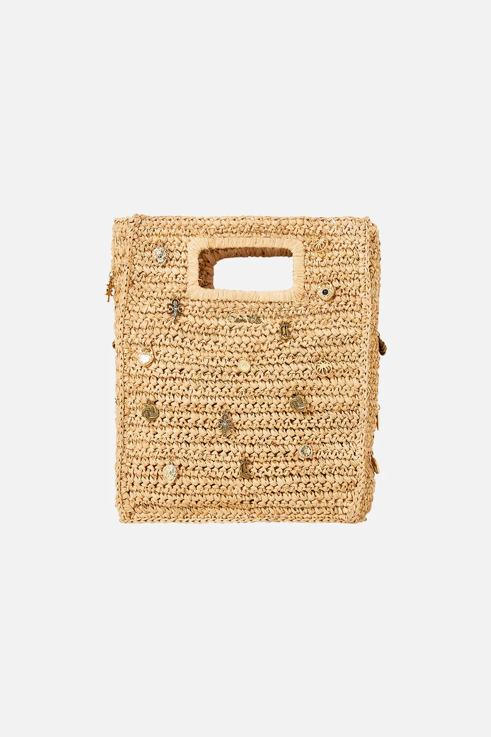 The Natural Raffia Mini North South Tote With Charms is a handcrafted accessory designed by our in house artisans. Reimagined for an exclusive limited edition collection, this mini tote is woven from natural raffia and adorned with bespoke CAMILLA charms. - 100% Raffia - Raffia Body - Custom Design Charm Embellishments - North South Shape - W 23cm X H 26cm SKU 00039386-NATURAL-O/S Fabric and Care MAIN: 100% RAFFIA