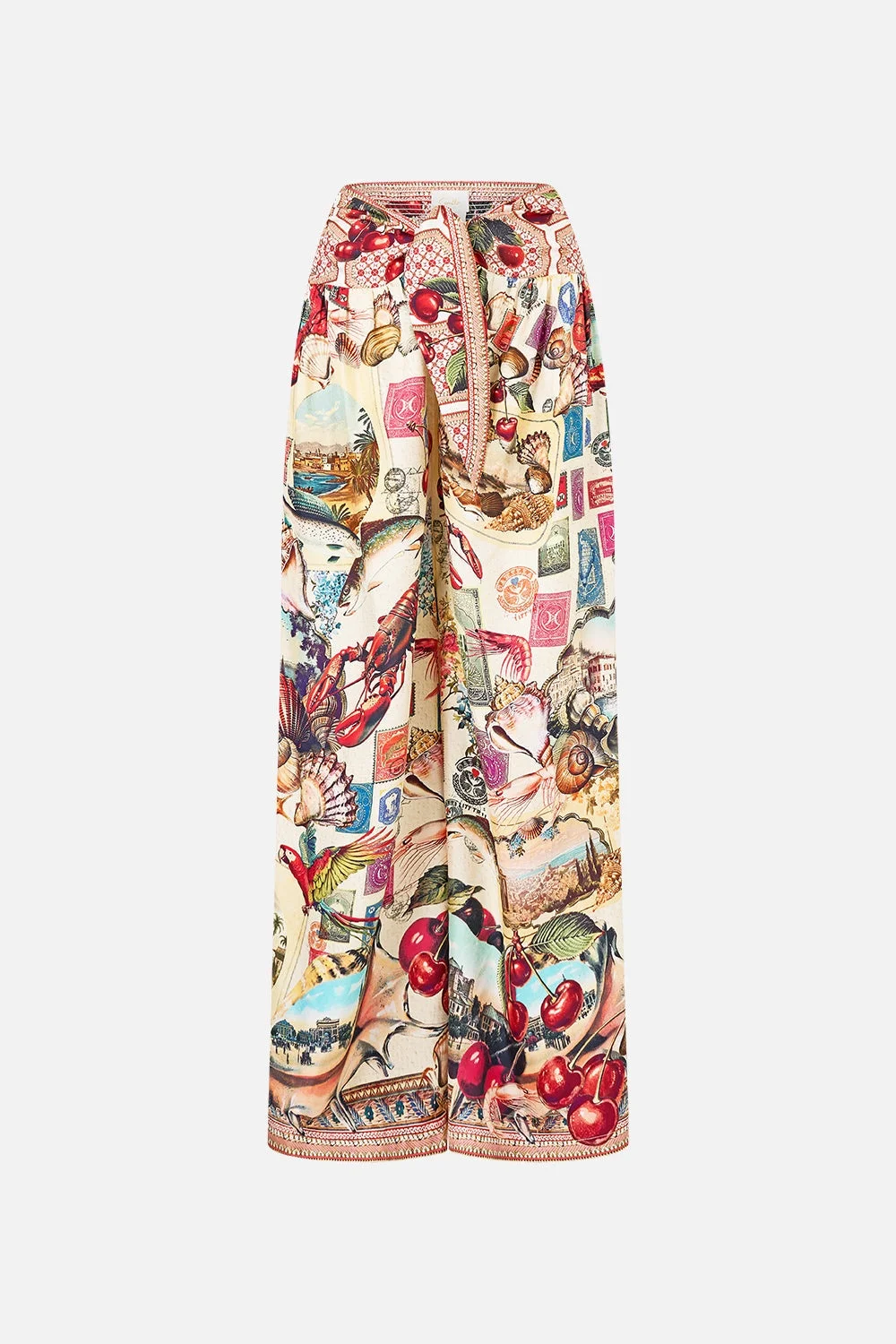 The Notes From The Road Relaxed Pant With Tie Front is a handcrafted silk silhouette designed by our in house artisans. Reimagined in an exclusive limited edition print, these relaxed full length pants are finished with tie front details, an elasticated back waist for comfort and wearability, and intricately applied crystal embellishments. - Relaxed Fit - Tie Front Detail - Back Waist Elastic - Crystal Embellishment SKU 00036589-NOTEROAD-XXS Size and Fit Our model is 5'9 (175cm) tall and is a size XXS (AU 6). Bust: 32in (81cm) Waist: 24in (61cm) Hips: 35in (89cm) Fabric and Care 100% SILK Silk twill is renowned for its diagonally-patterned weave and fluid texture. Its high thread count ensures rich density and durability, while its beautiful sheen provides a luscious touch to the skin.