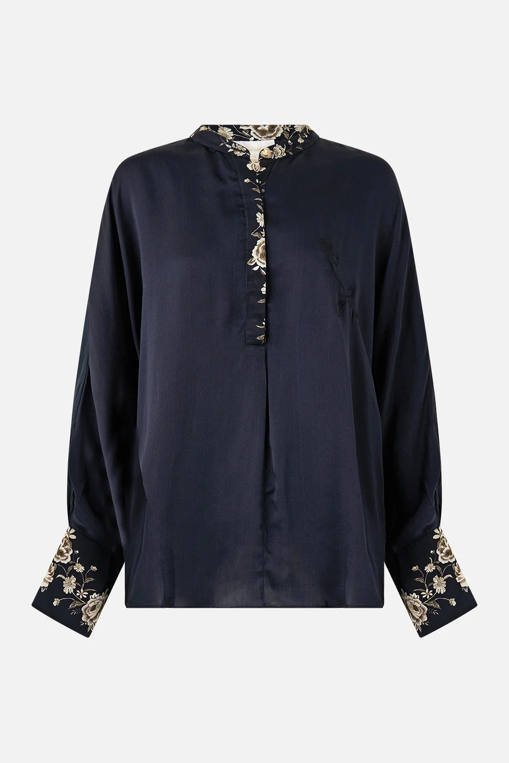 The Flamenco Folklore Relaxed Placket Detail Shirt is a handcrafted silhouette designed by our in-house artisans. Brought to life with meticulously placed embellishments, this silk placket blouse is thoughtfully cut with a high crew neckline dipped in pops of print. Falling to a hip-length hemline, it's finished with pleated statement cuffs. - 100% Silk - Relaxed Fit - Collar Stand - Pleated Cuff Detail - Crystal Embellishment SKU 00041939-FLAMFOLK-XXS Size and Fit Our model is 5'10 (178cm) tall and wears a size S (AU 10). Bust: 40in (101.6cm) Waist: 26.5in (67cm) Hips: 38in (96.5cm) Fabric and Care 100% SILK Silk satin embodies a sumptuously smooth finish that offers a rich buttery touch to the skin. As a result of the satin weaving technique, it masterfully creates a fuller bounce to the body and drape details.