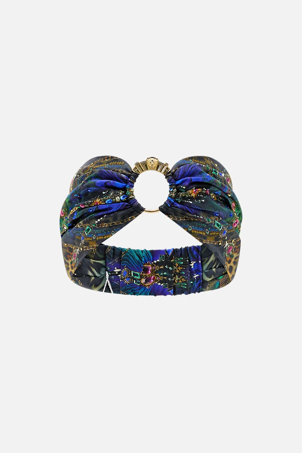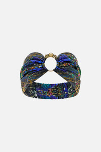 Designed in Australia, the Dominican Decadence Ring Headband unfolds in decadent plumes and iridescent blues, teal waves shimmer like glass, capturing the sparkle of forgotten monuments. Lovingly handcrafted, this luxury silk headband with an elegant twisted silhouette showcases an adjustable back section, custom ring detail and shimmers of crystal embellishments. - Crystals - Metal Ring Detail - Printed Silk - Elasticated Strap - W = 14CM, Head Circumference 56CM SKU 00035882-DOMIDECA-O/S Size and Fit Our model wears a CAMILLA O/S and is 5'10 (178cm) tall. Her standard dress size is an AU 10. She has a 32in (83cm) bust, 35in (89.5cm) hips and a 25in (66cm) waist. Fabric and Care MAIN: 100% SILK Silk twill is renowned for its diagonally-patterned weave and fluid texture. Its high thread count ensures rich density and durability, while its beautiful sheen provides a luscious touch to the skin.
