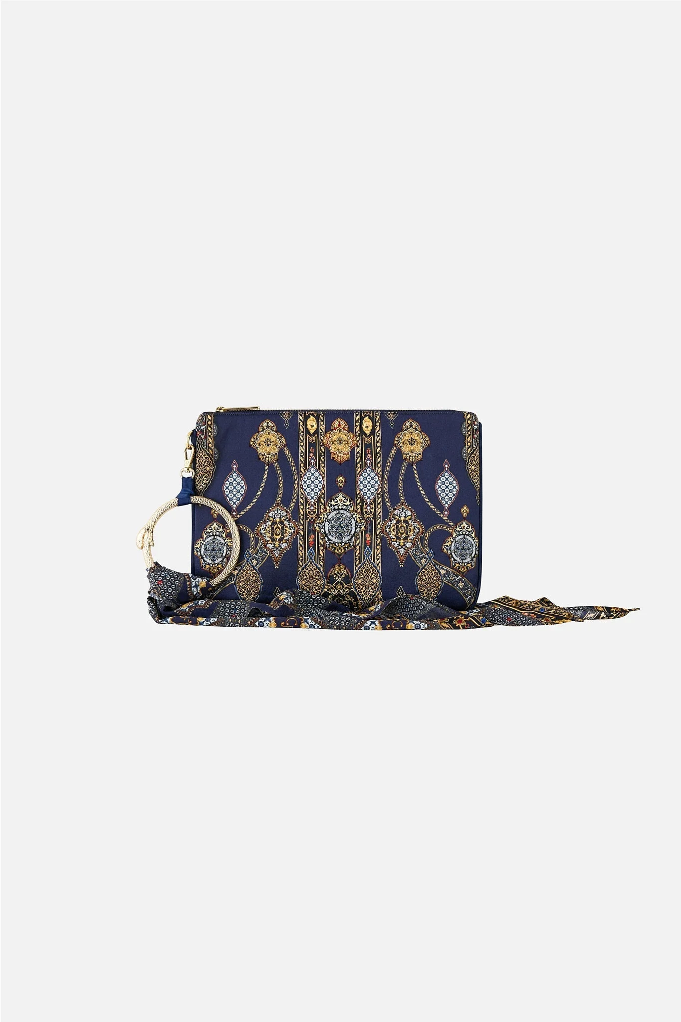 The The Imperial Gate Ring Scarf Clutch is a handcrafted silk silhouette designed by our in house artisans. Reimagined in an exclusive limited edition print, our zip-top clutch features a signature hardware ring wrapped with a detachable printed scarf. Crystal embellishment adds radiant detail, while an internal zip pocket keeps your essentials secure. - 100% Silk - Crystals - Internal Zip Pocket - Custom Hardware Ring - Detachable Scarf - Zip Top Opening - 26cm X 18.5cm SKU 00037563-IMPEGATE-O/S Size and Fit Our model wears a CAMILLA O/S and is 5'10 (178cm) tall. Her standard dress size is an AU 10. She has a 32in (83cm) bust, 35in (89.5cm) hips and a 25in (66cm) waist. Fabric and Care MAIN: 100% SILK Silk satin embodies a sumptuously smooth finish that offers a rich buttery touch to the skin. As a result of the satin weaving technique, it masterfully creates a fuller bounce to the body and drape details.