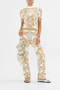 Designed in Australia, the Dressing Room Drama Ring Scarf Clutch unveils a black base fused with florals and gilded arches, echoing the regal opulence of the Palace of Queluz—a poetic nod to throne rooms and the queen's dressing sanctuary. Lovingly handcrafted this bespoke evening clutch bag showcases a signature CAMILLA print upon a sumptuous rectangular silhouette. The statement custom ring hardware is adorned with a detachable silk scarf and the zip top enclosure ensures sleek storage for all your treasures. - Crystal Embellishment - Internal Zip Pocket - Hardware Ring - Detachable Scarf - 26CM X 18.5CM SKU 00035863-DRESDRAM-O/S Size and Fit Our model wears a CAMILLA O/S and is 5'10 (178cm) tall. Her standard dress size is an AU 10. She has a 32in (83cm) bust, 35in (89.5cm) hips and a 25in (66cm) waist. Fabric and Care MAIN: 100% SILK Silk satin embodies a sumptuously smooth finish that offers a rich buttery touch to the skin. As a result of the satin weaving technique, it masterfully creates a fuller bounce to the body and drape details.