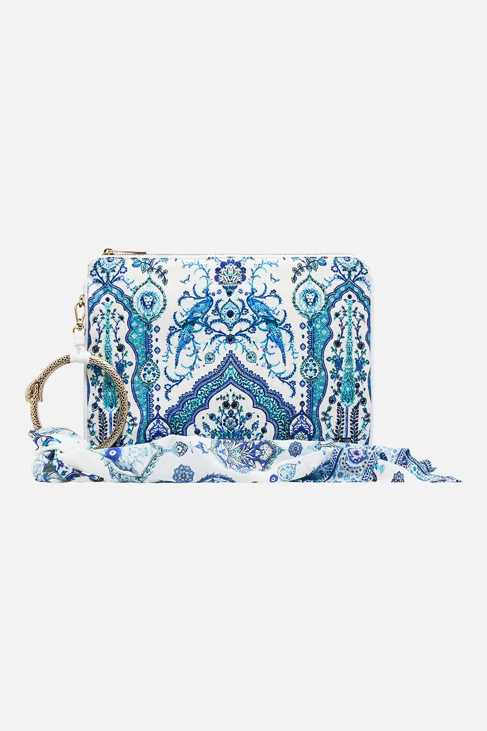 The Isnik Lullaby Ring Scarf Clutch is a handcrafted silk silhouette designed by our in house artisans. Reimagined in an exclusive limited edition print, our zip-top clutch features a signature hardware ring wrapped with a detachable printed scarf. Crystal embellishment adds radiant detail, while an internal zip pocket keeps your essentials secure. - 100% Silk - Crystals - Internal Zip Pocket - Custom Hardware Ring - Detachable Scarf - Zip Top Opening - 26cm X 18.5cm SKU 00037566-ISNILULL-O/S Size and Fit Our model wears a CAMILLA O/S and is 5'10 (178cm) tall. Her standard dress size is an AU 10. She has a 32in (83cm) bust, 35in (89.5cm) hips and a 25in (66cm) waist. Fabric and Care MAIN: 100% SILK Silk satin embodies a sumptuously smooth finish that offers a rich buttery touch to the skin. As a result of the satin weaving technique, it masterfully creates a fuller bounce to the body and drape details.