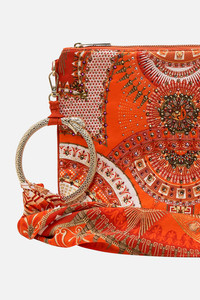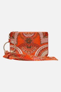 Designed in Australia, The Obelisk Gate Ring Scarf Clutch unearths the opulence of Dendera and Hatshepsut’s divine legacy. Adorned with heiroglyphs, majestic golden arches, and the Eye of Horus set against a rich burnt sunset backdrop Lovingly handcrafted this bespoke evening clutch bag showcases a signature CAMILLA print upon a sumptuous rectangular silhouette. The statement custom ring hardware is adorned with a detachable silk scarf and the zip top enclosure ensures sleek storage for all your treasures. - Internal Zip Pocket - Hardware Ring - Detachable Scarf - Contrast Piped Edge - 26Cm X 18.5Cm SKU 00032410-OBELGATE-O/S Size and Fit Our model wears a CAMILLA O/S and is 5'10 (178cm) tall. Her standard dress size is an AU 10. She has a 32in (83cm) bust, 35in (89.5cm) hips and a 25in (66cm) waist. Fabric and Care MAIN: 100% SILK Silk satin embodies a sumptuously smooth finish that offers a rich buttery touch to the skin. As a result of the satin weaving technique, it masterfully creates a fuller bounce to the body and drape details.