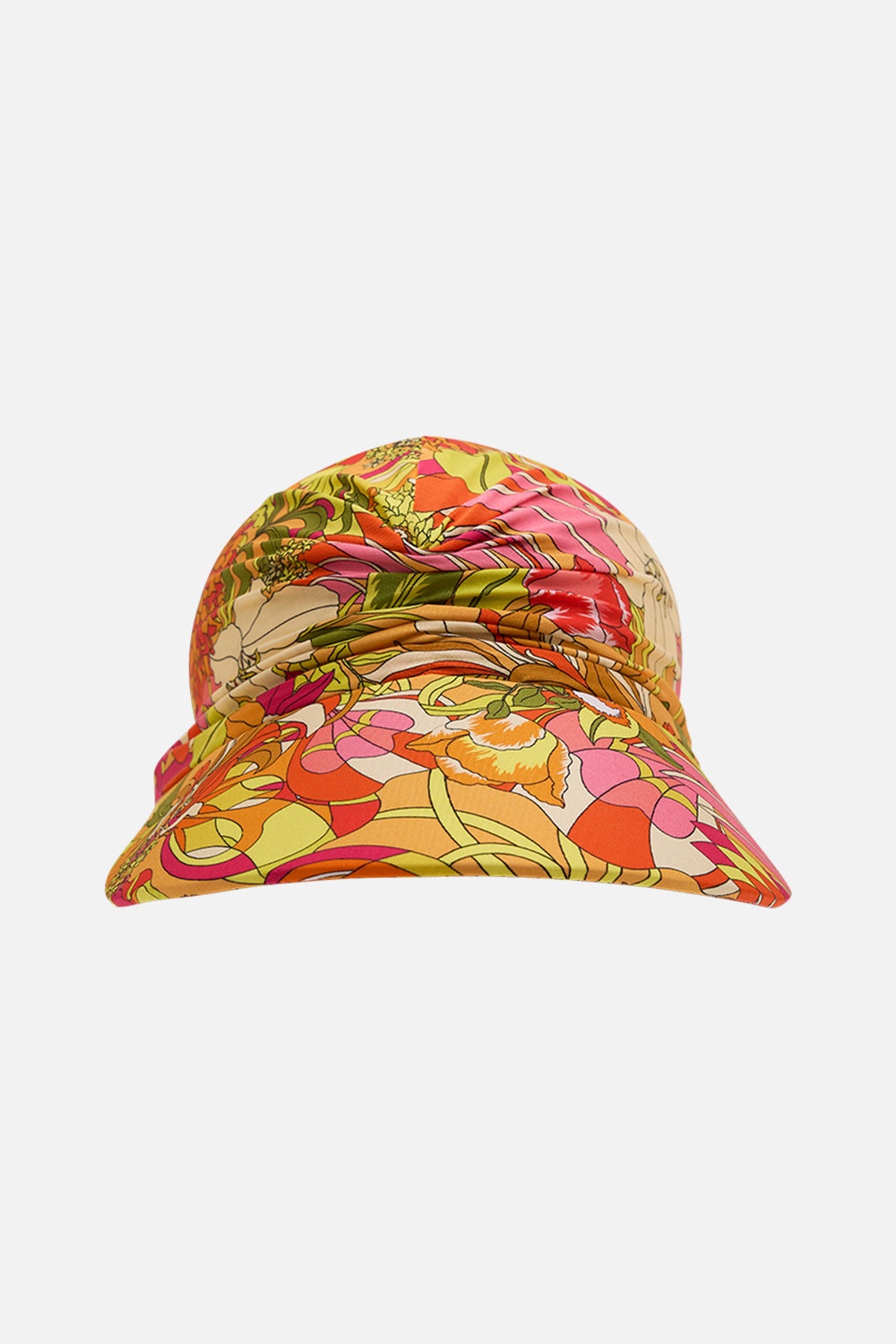 The Flower Child Society Ruched Beach Hat depicts a 70's inspired scene of vibrant orange imbued with statement retro florals. This luxury beach hat features a stretchy silhouette with lavish ruched front details and a wide softly structured brim. Explore more from the Wonderkind collection. - Lovingly Handcrafted - Designed in Australia - CAMILLA Accessories - Stretch jersey fabrication - Wide brim - Soft wrap top - Bespoke printed - Brim width 9.5cm, head cir 56cm SKU 00029249-FLOWCHIL-O/S Fabric and Care 82% RECYCLED NYLON, 18% ELASTANE