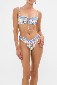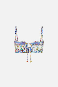 Designed in Australia, the Tiles Darls Ruched Underwire Bra With Tie reads the language of florals and tiles, blue and orange hues intertwine, a celebration of artisan hands and enduring beauty. Lovingly handcrafted, this ruched underwire bra designed for B-C cups, features removable foam pads and adjustable straps. The string tie front detailing and crystal embellishments elevate this piece to luxurious levels of comfort and style. - Fits B-C Cup - Removable Foam Pads - Removable Straps - Ruched Cup Detail - Ruched Front And Back - String Tie Front - Crystal Embellishment SKU 00035708-TILEDARL-XS Fabric and Care MAIN: 82% REGENERATED POLYAMIDE, 18% ELASTANE ECONYL® is regenerated nylon, crafted from waste materials that would otherwise end up polluting our Mother Earth. Its beauty lies in its ability to be recycled, remoulded and ultimately reused time and time again. An infinitely recyclable product that keeps our planet looking beautiful, it opens the door to a circular fashion sphere.