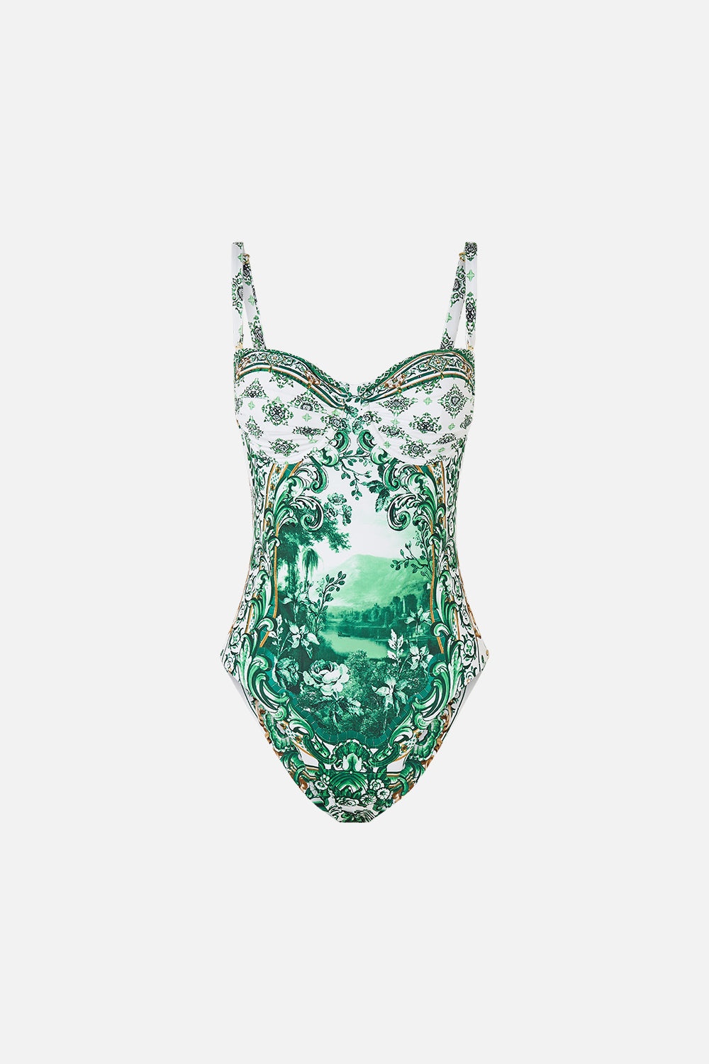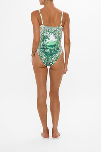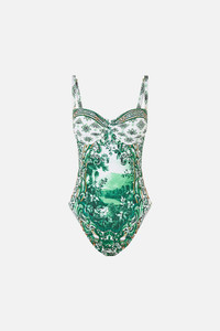 Designed in Australia, The Corridor Of Calm Ruched Cup Underwire One Piece is a tribute to Queluz Palace, entwining CAMILLA motifs with calming hues of green and gold—Azulejo tiles and architectural elegance unite, evoking peace and grandeur in every glance. Lovingly handcrafted, this luxury one-piece features a fitted shaped bust cup. With detachable straps and removable padding, this CAMILLA one-piece exudes opulent resort wear elegance. - Fits D-Cup - Removable Foam Pads - Removable Straps - Ruched Cup Detail - Crystal Embellishment - ECONYL® swim SKU 00034084-CORRCALM-XS Size and Fit Designed and fitted true to size, take your normal size Fabric and Care MAIN: 82% REGENERATED POLYAMIDE, 18% ELASTANE