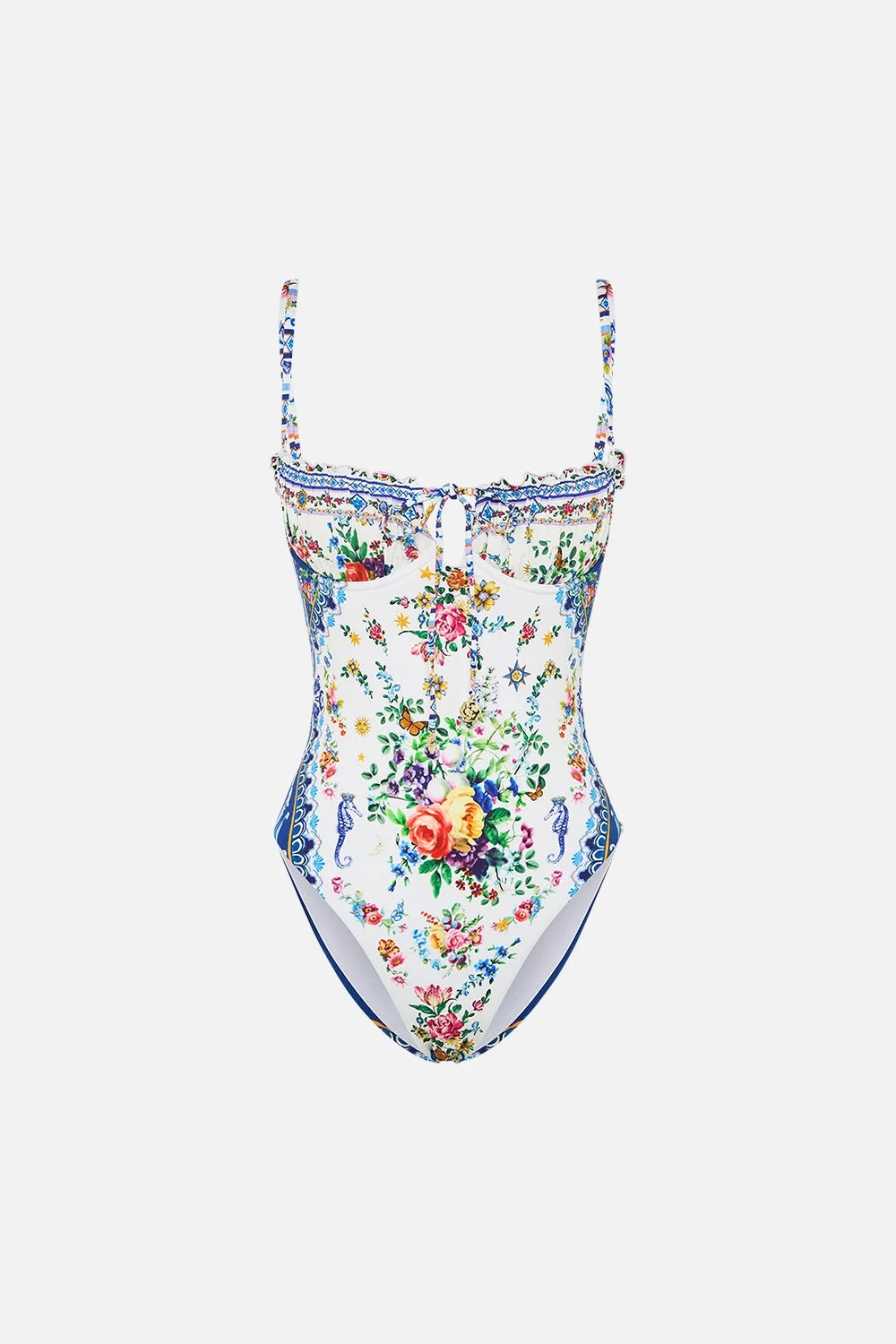 Designed in Australia, the Tiles Darls Ruched Underwire One Piece With Tie reads the language of florals and tiles, blue and orange hues intertwine, a celebration of artisan hands and enduring beauty. Lovingly handcrafted, this ruched underwire one-piece swimsuit is designed for D-Cups, features removable foam pads and adjustable straps. Crystal embellishments add a refined beauty to this luxurious swimwear. - Fits D-Cup - Removable Foam Pads - Removable Straps - Ruched Cup Detail - Crystal Embellishment SKU 00035663-TILEDARL-XS Fabric and Care MAIN: 82% REGENERATED POLYAMIDE, 18% ELASTANE ECONYL® is regenerated nylon, crafted from waste materials that would otherwise end up polluting our Mother Earth. Its beauty lies in its ability to be recycled, remoulded and ultimately reused time and time again. An infinitely recyclable product that keeps our planet looking beautiful, it opens the door to a circular fashion sphere.