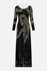 Designed in Australia, The Call Me Cleopatra Ruched Jersey Dress With Hardware And Chain exudes divine goddess symbolism, imbuing Egyptian revival motifs with tonal serpent and metallic details on a black base. Lovingly handcrafted, this opulent jersey dress boasts a fitted bodice that transitions into a gracefully flared skirt. Enhanced with ruched detailing and a chain neck accent, its maxi hemline and crystal embellishments create a stunningly elegant silhouette. - Fitted Bodice With Flare Skirt - Ruched Detail - Chain Neck Detal - Crystal Embellishment - Maxi Hemline SKU 00031488-CALMCLEO-XS Size and Fit Our model wears a CAMILLA S and is 5'10 (178cm) tall. Her standard dress size is an AU 10. She has a 32in (83cm) bust, 35in (89.5cm) hips and a 25in (66cm) waist. Camilla S = AU10 / UK10 / US6 Designed and fitted true to size, take your normal size. Fabric and Care 92% VISCOSE 8% ELASTANE- AS PER SMS FABRIC Viscose is a fibre crafted from the natural substance, cellulose, known for its softness, breathability and drape. It possesses a subtle sheen and is perfect for lightweight soft tailored silhouettes or more structured styles in heavier weights.