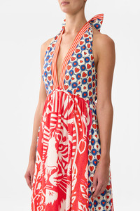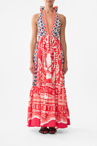 Designed in Australia, the Rinse & Roar Ruffle Hem Halter Dress prowls with daring contrasts, tigers emerge amidst red and blue strokes creating a monochromatic masterpiece of wild wonder. Lovingly handcrafted, this CAMILLA halter dress excudes feirceness. The full skirt flows effortlessly, while the adjustable halter tie and low back add allure. Dazzling crystal embellishments and a playful ruffle hem bring a hint of CAMILLA signature charm. - Full Skirt - Adjustable Halter Tie - Low Back - Crystal Embellishment - Ruffle Hem - SKU 00034999-RINSROAR-XS Size and Fit Our model wears a CAMILLA S and is 5'10 (178cm) tall. Her standard dress size is an AU 10. She has a 32in (83cm) bust, 35in (89.5cm) hips and a 25in (66cm) waist. Camilla S = AU10 / UK10 / US6 Fabric and Care 100% ORGANIC COTTON Organic cotton poplin is sumptuously smooth with a crisp, refined weave. This lightweight silken fabric drapes beautifully and is ideal for sleek contours and tailored, defined styles.
