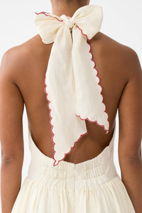 The High Class Hookah Ruffle Hem Halter Dress is a handcrafted silhouette designed by our in house artisans. Reimagined in an exclusive limited edition print, our signature halter dress is an ode to the feminine form. A full length skirt is completed with a fitted bodice and adjustable halter neck ties, as crystal embellishments adorn the plunging V neckline. - 100% Linen - Full Skirt - Adjustable Halter Tie - Low Back - Embroidery Detailing SKU 00038292-HIGHHOOK-XS Size and Fit Our model is 5'10 (178cm) tall and wears a size S (AU 10). Bust: 40in (101.6cm) Waist: 26.5in (67cm) Hips: 38in (96.5cm) Designed and fitted true to size, take your normal size. Fabric and Care 100% LINEN Made from flax fibres, this lightweight natural fibre offers a timeless aesthetic that adds durability and longevity to any wardrobe. Its breathability keeps your skin cool, minimises moisture and ensures effortless comfort.