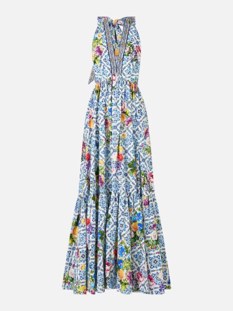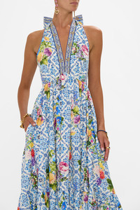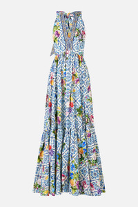 Designed in Australia, The Wall To Wall Wonders Ruffle Hem Halter Dress captures the grandeur of Queluz Palace, with soft blues and golden yellows of Azulejo tiles, blending history and artistry in a panoramic view of Portugal’s timeless beauty. Lovingly handcrafted, this CAMILLA halter dress is an ode to elegance. The full skirt flows effortlessly, while the adjustable halter tie and low back add a touch of allure. Dazzling crystal embellishments and a playful ruffle hem bring a hint of CAMILLA signature charm. - Fitted Bodice With Adjustable Halter Tie - Full Length Skirt - Centre Back Zip Closure - Crystal Embellishment - Ruffle Hem - Non-Sheer SKU 00033754-WALLWOND-XXS Size and Fit Designed and fitted true to size, take your normal size Fabric and Care 100% ORGANIC COTTON