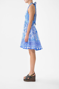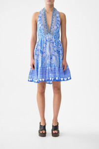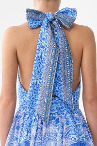 The The Bosphorous Ruffle Hem Halter Short Dress is a handcrafted linen silhouette designed by our in house artisans. Reimagined in an exclusive limited edition print, our backless mini dress features adjustable halter neck ties and an elasticated back bodice as the full skirt is finished with a ruffled hemline. - 100% Linen - Adjustable Halter Tie - Backless - Full Skirt With Hem Frill - Elasticated Back Bodice - Centre Back Zipper - Crystal Embellishment SKU 00041693-BOSPHORS-XXS Size and Fit Our model is 5'10 (178cm) tall and wears a size S (AU 10). Bust: 40in (101.6cm) Waist: 26.5in (67cm) Hips: 38in (96.5cm) Designed and fitted true to size, take your normal size. Fabric and Care 100% LINEN Made from flax fibres, this lightweight natural fibre offers a timeless aesthetic that adds durability and longevity to any wardrobe. Its breathability keeps your skin cool, minimises moisture and ensures effortless comfort.