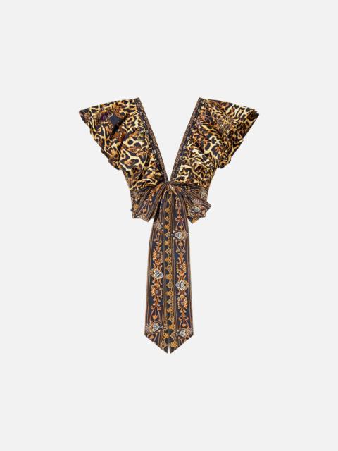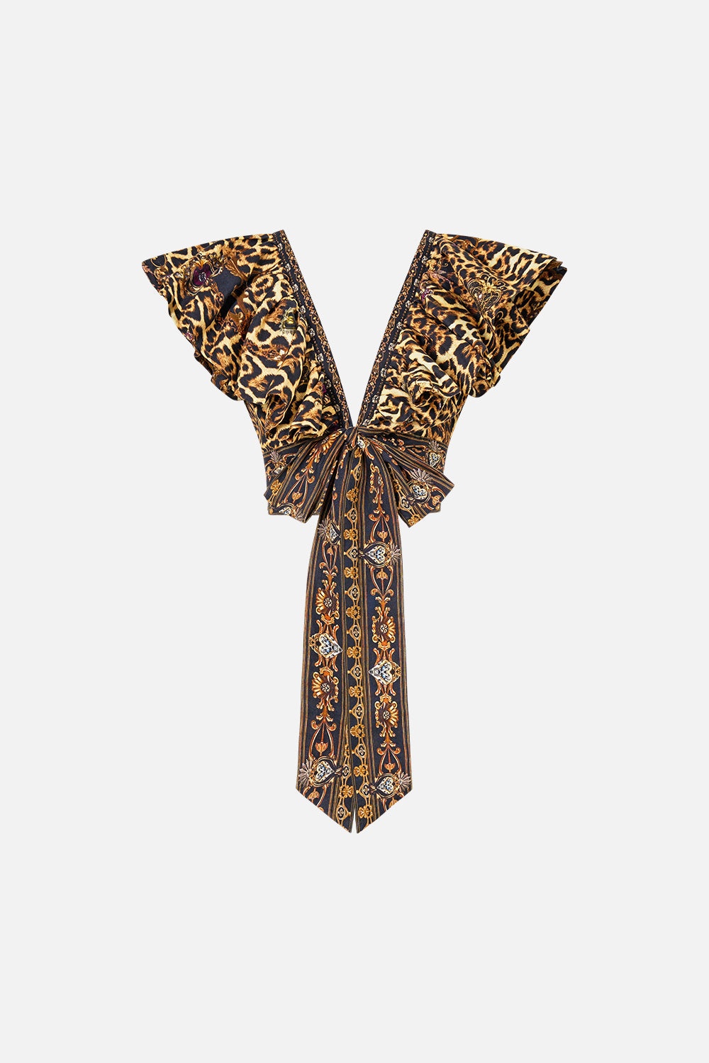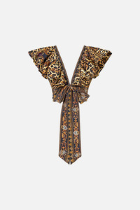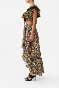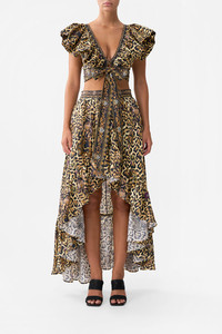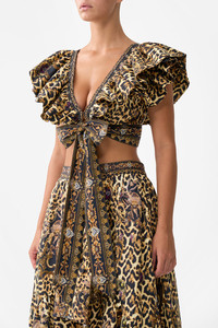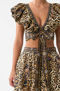 Designed in Australia, The Saints And Sisters Ruffle Wrap Top celebrates Portugal’s architectural grandeur with a touch of the wild—leopard print meets sacred artistry, blending nostalgia and wanderlust in every hand-illustrated design. Lovingly handcrafted, this linen ruffle wrap top features a fitted bodice and a chic cropped length. The voluminous ruffle detail and wrap-front design create a playful yet elegant silhouette, enhanced by exquisite crystal embellishments adorned along the neckline, waist and tie ends. - Fitted Bodice - Cropped Length - Voluminous Ruffle Detail - Wrap Front Design - Crystal Embellishments SKU 00033650-SAINSIST-XXS Size and Fit Designed and fitted true to size, take your normal size Fabric and Care 100% LINEN Linen is a lightweight natural fibre that offers a timeless aesthetic, adding durability and longevity to any wardrobe. Its breathability keeps your skin cool, minimises moisture and ensures effortless comfort.