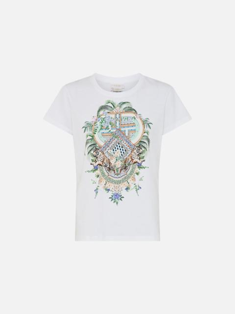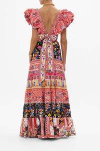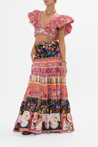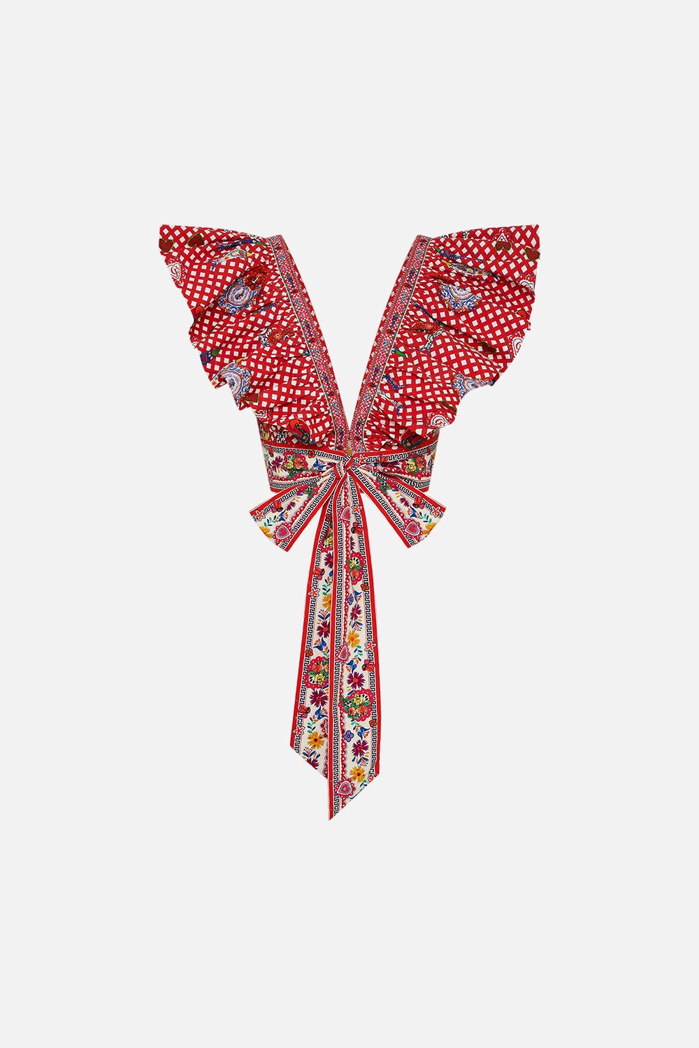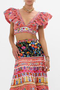 Designed in Australia, The Faith, Luck & Justice Ruffle Wrap Top draws you into the heart of Portuguese folklore—where the Barcelos Cockerel and vibrant fish motifs dance among colourful blooms and kitchy textiles, capturing market magic and tales of faith. Lovingly handcrafted, this ruffle wrap top features a fitted bodice and a chic cropped length. The voluminous ruffle detail and wrap-front design create a playful yet elegant silhouette, enhanced by exquisite crystal embellishments and delicate embroidery. - Fitted Bodice - Cropped Length - Voluminous Ruffle Detail - Wrap Front Design - Non-Sheer SKU 00033920-FATHJUST-XXS Size and Fit Designed and fitted true to size, take your normal size Fabric and Care 100% ORGANIC COTTON