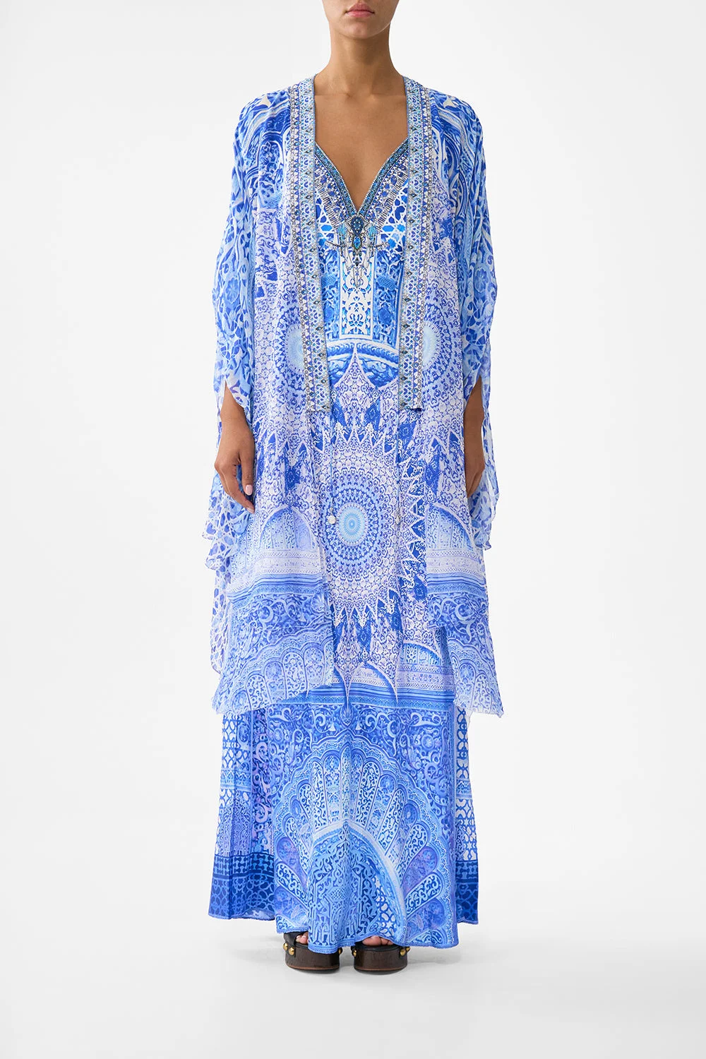 The The Bosphorous Scalloped Edge Layer is a handcrafted silk silhouette designed by our in house artisans. Reimagined in an exclusive limited edition print, this long sleeved, layering piece is cut in a relaxed fit that falls to a midi length hemline. It features tassels at the end of the neckband and is adorned with scalloped edging, this multi layered style is both versatile and captivating. - 100% Silk - Relaxed Fit - Midi Length - Tassels At Neckband End - Multi Layered Style With Scallop Edging - Crystal Embellishment - Fabric SKU 00041692-BOSPHORS-O/S Size and Fit Our model wears a CAMILLA O/S and is 5'10 (178cm) tall. Her standard dress size is an AU 10. She has a 32in (83cm) bust, 35in (89.5cm) hips and a 25in (66cm) waist. Designed as a relaxed fit. Take your normal size, or select one size smaller for a neater fit. Fabric and Care 100% SILK Meticulously crafted with a tighter weave that enhances its structure, silk georgette showcases an ethereal, semi-sheer fabric with a delicate grainy texture, creating a soft bounce and decadent draping.