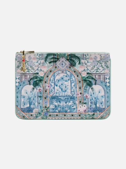 Designed in Australia, The Lisboa Luxe Scarf Clutch unravels an oasis where cranes soar among lush ferns, intricate tilework, and dreamlike ceramics—a soft scarlet sanctuary, each detail whispering stories of wonder. Lovingly handcrafted, this luxury evening clutch bag showcases a signature bespoke print upon its sumptuous rectangular silhouette. The detachable twisted scarf wristlet and the zip top enclosure with golden hardware ensures a sleek yet statement wearability. - CAMILLA Printed - Detachable Scarf Wristlet - Crystals - Zip Top Opening - 26cm X 18.5cm SKU 00034132-LISBLUXO-O/S Fabric and Care MAIN: 100% SILK