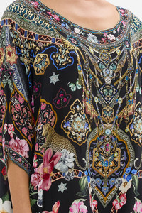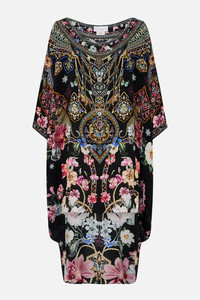 Designed in Australia, The Midnight in Monserrate Scoop Back Hem Dress celebrates the lush gardens and eclectic nineteenth-century architecture under an exsquisite midnight sky. Lovingly handcrafted, this luxury short kaftan dress features an elegant wide round neckline that falls into a flowy relaxed fit throughout the body. The high low hemline creates a dramatic billow as a mini dress or worn as a tunic with pants or leggings. - Crystal Embellishment - Round Neckline - Relaxed Fit - 3/4 Length Sleeves - Crystal Embellishment - Short Length SKU 00036177-MIDNMONS-O/S Size and Fit Designed as a relaxed fit, take your normal size or select one size smaller for a neater fit Fabric and Care 100% SILK With its subtly textured surface, silk crepe is our core fabrication made perfect for versatile wear. With its ability to hold alternative ways to wear, this decadent fabric drapes elegantly off the body whilst keeping you cool with its breathable nature.