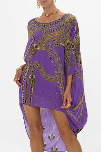 Designed in Australia, The Luxorland Lady Scoop Back Hem Dress is a fusion of symbolic adornments and Egyptian revival, featuring an ornate blend of purple, gold, and metallic imbued with serpent and jewel detail. Lovingly handcrafted, this luxury short kaftan dress features an elegant wide round neckline that falls into a flowy relaxed fit throughout the body. The high low hemline creates a dramatic billow as a mini dress or worn as a tunic with pants or leggings. - Round Neckline - Relaxed Fit - 3/4 Length Sleeves - Crystal Embellishment - Short Length SKU 00034446-LUXOLADY-O/S Size and Fit Our model wears a CAMILLA S and is 5'10 (178cm) tall. Her standard dress size is an AU 10. She has a 32in (83cm) bust, 35in (89.5cm) hips and a 25in (66cm) waist. CAMILLA Size S = AU10 / UK10 / US6 Our More to Love Model wears a CAMILLA Size 3XL and is 5'9 (182cm) tall. Her standard dress size is a AU 20. She has a 42in (107cm) bust, 35.8in (91cm) waist and 46in (118cm) hips. CAMILLA Size 3XL = AU20 / UK20 / US16 Designed as a relaxed fit, take your normal size or select one size smaller for a neater fit Fabric and Care 100% SILK With its subtly textured surface, silk crepe is our core fabrication made perfect for versatile wear. With its ability to hold alternative ways to wear, this decadent fabric drapes elegantly off the body whilst keeping you cool with its breathable nature.