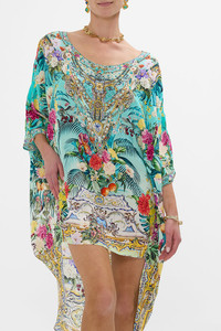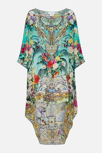 Designed in Australia, The Gardens Of Queluz Scoop Back Hem Dress invites you into Queluz Palace, where vivid greens and lush florals blend with the elegance of Azulejo tiles, celebrating nature and artful design. Lovingly handcrafted, this luxury short kaftan dress features an elegant wide round neckline that falls into a flowy relaxed fit throughout the body. The high low hemline creates a dramatic billow as a mini dress or worn as a tunic with pants or leggings. - Crystal Embellishment - Round Neckline - Relaxed Fit - 3/4 Length Sleeves - Short Length SKU 00033235-GARDQUEL-O/S Size and Fit Designed as a relaxed fit, take your normal size or select one size smaller for a neater fit Fabric and Care 100% SILK With its subtly textured surface, silk crepe is our core fabrication made perfect for versatile wear. With its ability to hold alternative ways to wear, this decadent fabric drapes elegantly off the body whilst keeping you cool with its breathable nature.