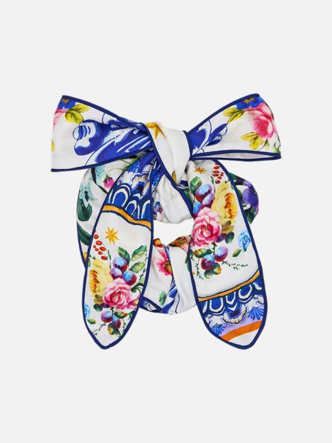 Designed in Australia, the Aromatic Tiger Flower Scrunchie With Bow dances with shimmering hues alongside a pearlescent ivory backdrop. Lovingly handcrafted, this elasticated scrunchie adorned with a playful bow detail in Camilla’s signature prints, is the perfect accessory to add a pop of colour and luxury to any hairstyle. - CAMILLA Printed - Elasticated - Bow Detail - W = 6CM, Tie Length = 25CM SKU 00035895-AROMFLOR-O/S Size and Fit Our model wears a CAMILLA O/S and is 5'10 (178cm) tall. Her standard dress size is an AU 10. She has a 32in (83cm) bust, 35in (89.5cm) hips and a 25in (66cm) waist. Fabric and Care MAIN: 100% SILK Silk twill is renowned for its diagonally-patterned weave and fluid texture. Its high thread count ensures rich density and durability, while its beautiful sheen provides a luscious touch to the skin.