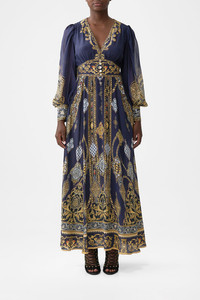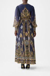 The The Imperial Gate Shaped Waistband Dress With Gathered Sleeves is a handcrafted silk silhouette designed by our in house artisans. Reimagined in an exclusive limited edition print, our shaped waistband dress is framed with a flattering V neckline and shirred back for adjustable comfort. Softly gathered sleeves cascade with delicate frills, adding fluidity, form and a touch of romance to every movement. - 100% Silk - Fitted At Waist With Flared Skirt - Full Length - Deep V Neckline - Front Button Closure SKU 00036596-IMPEGATE-XXS Size and Fit Our model is 5'10 (178cm) tall and wears a size S (AU 10). Bust: 40in (101.6cm) Waist: 26.5in (67cm) Hips: 38in (96.5cm) Designed and fitted true to size, take your normal size. Fabric and Care SELF-100% SILK CONTRAST-100% SILK With its subtly textured surface, silk crepe is our core fabrication made perfect for versatile wear. With its ability to hold alternative ways to wear, this decadent fabric drapes elegantly off the body whilst keeping you cool with its breathable nature.