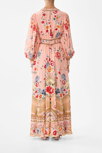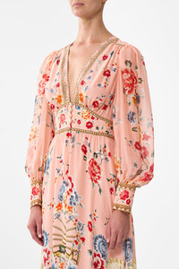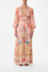 Designed in Australia, the Majestic Milla Shaped Waistband Dress With Gathered Sleeves echoes the charm of Majestic Cafe. Romantic tones and delicate florals blend with delicate desires, inspired by its rich artistic spirit. Lovingly handcrafted, this luxury silk maxi dress showcases a plunging neckline with a slightly blousy bodice that cinches into an adjustable waistband. The soft gathered skirt flares to dance at full length for ultimate romantic billow, while the poetic blouson sleeves gather into wide shirred cuffs at the wrist line. - Fitted At Waist With Flared Skirt - Full Length - Deep V Neckline - Front Button Closure - Crystal Embellishment - SKU 00035701-MAJEMILL-XXS Size and Fit Designed and fitted true to size, take your normal size. Fabric and Care 100% SILK, CONTRAST-100% SILK, LINING-100% SILK With its subtly textured surface, silk crepe is our core fabrication made perfect for versatile wear. With its ability to hold alternative ways to wear, this decadent fabric drapes elegantly off the body whilst keeping you cool with its breathable nature.