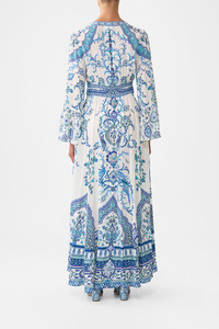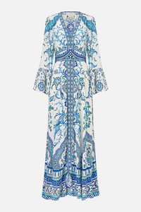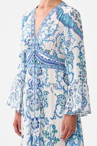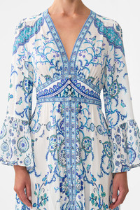 The Isnik Lullaby Shaped Waistband Dress With Ruffle Sleeve is a handcrafted silk silhouette designed by our in house artisans. Reimagined in an exclusive limited edition print, our shaped waistband dress features draped ruffle sleeves and a flattering v neckline. A sculpted waistband defines the feminine form while the shirred back waist adds gentle stretch and ease, balancing structure with fluidity in motion. Discover how to wear our Shaped Waistband Dress in more ways than one with the CAMILLA Style Guide. - 100% Silk - V Neck - Fitted Shaped Waist - Shirred Back Waist - Draped Sleeves With Frill SKU 00036542-ISNILULL-XXS Size and Fit Our model is 5'10 (178cm) tall and wears a size S (AU 10). Bust: 40in (101.6cm) Waist: 26.5in (67cm) Hips: 38in (96.5cm) Fabric and Care 100% SILK With its subtly textured surface, silk crepe is our core fabrication made perfect for versatile wear. With its ability to hold alternative ways to wear, this decadent fabric drapes elegantly off the body whilst keeping you cool with its breathable nature.