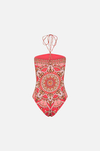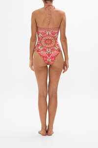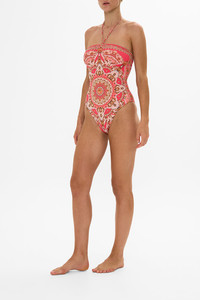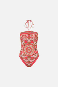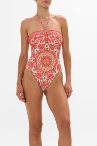 The Shell Games Bandeau One Piece With Halter Tie is an immersion into a vibrant coral world of intricate mosaics of delicate shells, pearls and opulent golden flourishes. A luxury CAMILLA one piece swimsuit that showcases a fitted streamlined silhouette. Wear as a strapless bandeau style or attach the thin halter straps for added support and resort wear elegance. Explore more from the Wonderkind collection. - Lovingly Handcrafted - Designed in Australia - ECONYL® swim - Fits a-c cup - Removable soft cups - Removable halter tie - Crystal embellishment - High cut leg - Sustainable swimwear SKU 00028326-SHELLGAM-XS Size and Fit Our model wears a CAMILLA S and is 5'10 (178cm) tall. Her standard dress size is an AU 10. She has a 32in (83cm) bust, 35in (89.5cm) hips and a 25in (66cm) waist. Camilla S = AU10 / UK10 / US6 Fabric and Care 82% REGENERATED POLYAMIDE, 18% ELASTANE ECONYL® is an eco-friendly regenerated nylon made entirely from items such as old fishing nets, and industrial plastic recovered from our oceans. ECONYL® is strong, lightweight, and elastic which makes it the perfect fabric for form fitting styles. Its sustainability and water repellent qualities provide a luxurious base for bespoke CAMILLA swimwear.
