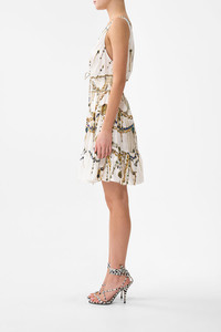 The Chain Gang Shirred Waist Detail Mini Dress is a handcrafted silhouette designed by our in house artisans. Reimagined in an exclusive limited edition print, this mini dress features a V neckline that meets a shirred waistband for effortless wear. It is decorated with charms and tassels on tie ends and intricately placed crystal embellishment for luminous detail. - 100% Silk - Shirred Waistband - V Front & Back Neckline - Front Tie Detail With Camilla Tassel Charms - Gathered Skirt Frill - Crystal Embellishment SKU 00038351-CHAINGNG-XXS Size and Fit Our model is 5'10 (178cm) tall and wears a size S (AU 10). Bust: 40in (101.6cm) Waist: 26.5in (67cm) Hips: 38in (96.5cm) Designed and fitted true to size, take your normal size. Fabric and Care 100% SILK Silk satin embodies a sumptuously smooth finish that offers a rich buttery touch to the skin. As a result of the satin weaving technique, it masterfully creates a fuller bounce to the body and drape details.
