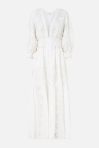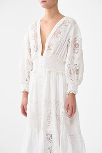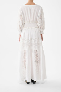 The All About That Lace Shirred Waistband Long Dress is a handcrafted linen silhouette designed by our in house artisans. Reimagined in an exclusive limited edition print, this opulent full length dress is framed by long puff sleeves that taper into shirred cuffs. A shirred waistband ensures a flattering fit across the form, while lace trims and intricate embroidery bring decadent detail to the design. - 100% Linen - Shirred Waistband - Puff Sleeves - Shirred Cuffs - Lace Trim Inserts - Machine Embroidery - Full Length SKU 00038362-ABOULACE-XS Size and Fit Designed as a relaxed fit. Take your normal size, or select one size smaller for a neater fit. Fabric and Care 100% LINEN Made from flax fibres, this lightweight natural fibre offers a timeless aesthetic that adds durability and longevity to any wardrobe. Its breathability keeps your skin cool, minimises moisture and ensures effortless comfort.
