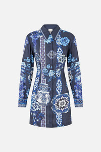 The A Tiled Wonderland Shirt Dress With A Line Skirt is a handcrafted silhouette designed by our in-house artisans. Envisioned in an exclusive limited edition print, our silk-linen mini shirt dress is slim fitting and elevated with a collar and buttoned cuffs. It's finished with intricately placed crystal embellishment. - 80% European Linen, 20% Silk - Covered Placket Detail - Stand Collar - Buttoned Cuff - Elastic At Back Waist For Ease - Silk Linen Fabric SKU 00040652-ATILWOND-XXS Size and Fit Our model is 5'10 (178cm) tall and wears a size S (AU 10). Bust: 40in (101.6cm) Waist: 26.5in (67cm) Hips: 38in (96.5cm) Designed and fitted true to size, take your normal size. Fabric and Care 80% LINEN, 20% SILK Grown in Europe with minimal water and few pesticides, this lightweight natural fibre offers durability and longevity to your wardrobe. Its breathability keeps your skin cool, minimises moisture and ensures effortless comfort. With European production minimising environmental impact, this exclusive linen is a highly sustainable fibre that gives back to you and our captivating, Mother Earth.