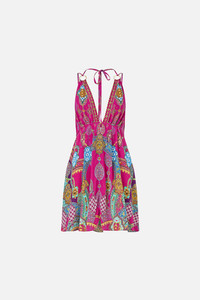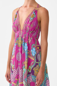 The Concubines, Sultans & Courtiers Short Flared Dress With Hardware is a handcrafted silk silhouette designed by our in house artisans. Reimagined in an exclusive limited edition print, our luxury mini dress features a plunging V neckline with a sculptural cut-out beneath the bust framed by statement O-ring details. A regular fit is softened by an elasticated back panel for comfort and shape, while adjustable neck ties adorned with tassels add a playful, customisable finish. - 100% Silk - Regular Fit With Elasticated Back - O-Ring Detail At Front Neck - Adjustable Neck Ties With Tassels - V Cut Out At Underbust SKU 00036849-CONCSULT-XXS Size and Fit Our model is 5'10 (178cm) tall and wears a size S (AU 10). Bust: 40in (101.6cm) Waist: 26.5in (67cm) Hips: 38in (96.5cm) Designed and fitted true to size, take your normal size. Fabric and Care SELF-100% SILK CONTRAST-100% SILK With its subtly textured surface, silk crepe is our core fabrication made perfect for versatile wear. With its ability to hold alternative ways to wear, this decadent fabric drapes elegantly off the body whilst keeping you cool with its breathable nature.