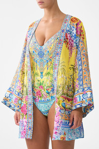 The Sultanahmet Summer Short Kimono Wrap is a handcrafted linen silhouette designed by our in house artisans. Reimagined in an exclusive limited edition print, our short kimono wrap is cut in a relaxed fit with generous sleeves and side splits for ease of movement. Intentionally crafted for versatility and layering, it features a separate tie belt for effortless wear, while intricately placed crystal embellishments add luminous detail.. - 100% Linen - Relaxed Fit - Short Length - Wide Sleeve - Side Splits - Separate Tie Belt - Crystal Embellishment SKU 00038566-SULTSUMM-XS Size and Fit Our model is 5'10 (178cm) tall and wears a size S (AU 10). Bust: 40in (101.6cm) Waist: 26.5in (67cm) Hips: 38in (96.5cm) Designed and fitted true to size, take your normal size. Fabric and Care 100% LINEN Made from flax fibres, this lightweight natural fibre offers a timeless aesthetic that adds durability and longevity to any wardrobe. Its breathability keeps your skin cool, minimises moisture and ensures effortless comfort.