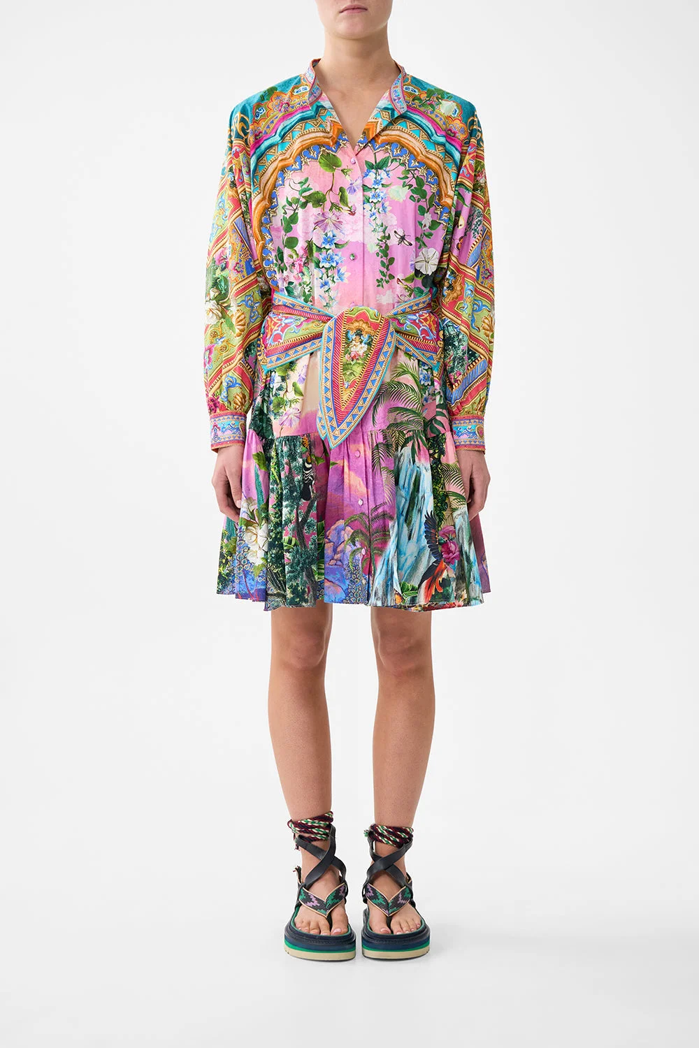 The Turkish Delight Short Tiered Shirtdress With Wide Waist Tie is a handcrafted silhouette designed by our in house artisans. Reimagined in an exclusive limited edition print, this relaxed mini dress features a beautifully tiered skirt and a wide adjustable waistband for versatility. Its finished with intricately placed crystal embellishments, adding luminous eye catching detail. - 100% Organic Cotton - Relaxed Fit - Short Length - Wide Waist Tie Detail - Tiered Skirt - Crystal Embellishment SKU 00038882-TURKDELI-XXS Size and Fit Our model is 5'10 (178cm) tall and wears a size S (AU 10). Bust: 40in (101.6cm) Waist: 26.5in (67cm) Hips: 38in (96.5cm) Fabric and Care 100% ORGANIC COTTON Organic cotton poplin is sumptuously smooth with a crisp, refined weave. This lightweight silken fabric drapes beautifully and is ideal for sleek contours and tailored, defined styles.