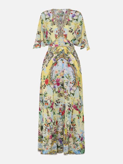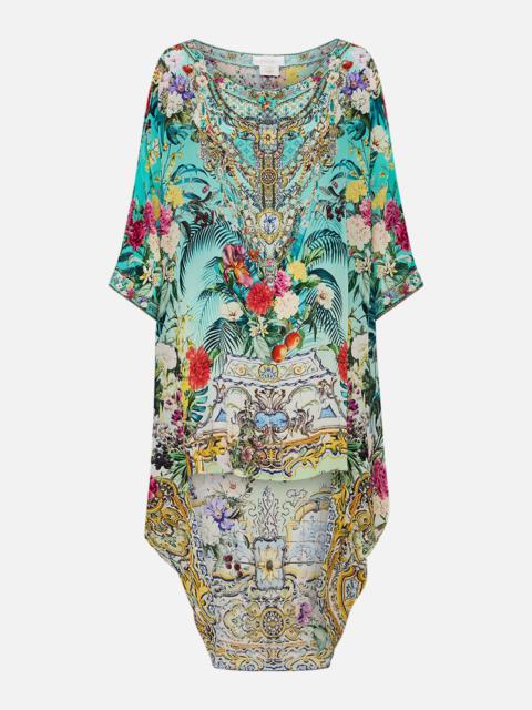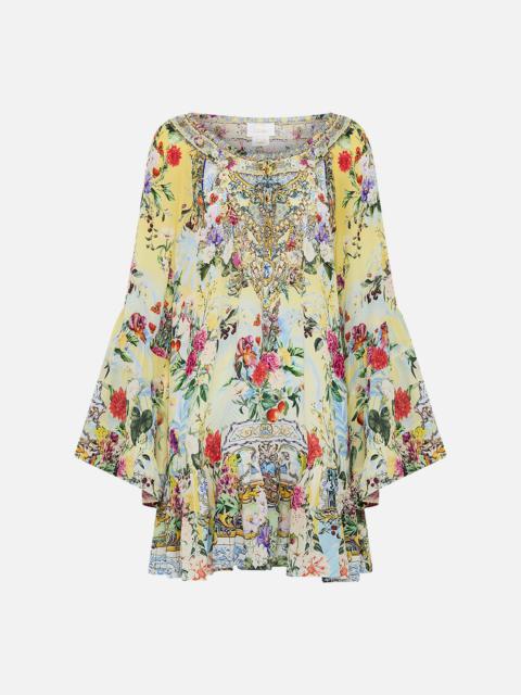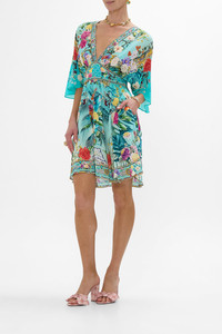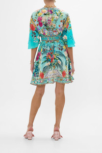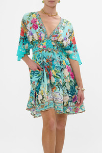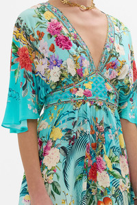 Designed in Australia, The Gardens Of Queluz Short Waisted Dress invites you into Queluz Palace, where vivid greens and lush florals blend with the elegance of Azulejo tiles, celebrating nature and artful design. Lovingly handcrafted, this elegant silk mini dress features a soft voluminous bodice that cinches into an adjustable shaped waistband detail. The skirt softly gathers and drapes into a flare at mid thigh and the batwing style ruffle sleeves create decadent drape at elbow length. - V Neck - Shirred Back Waistband - Draped Sleeve - Pockets - Crystal Embellishment - Non-Sheer SKU 00033238-GARDQUEL-XXS Size and Fit Designed and fitted true to size, take your normal size Fabric and Care 100% SILK With its subtly textured surface, silk crepe is our core fabrication made perfect for versatile wear. With its ability to hold alternative ways to wear, this decadent fabric drapes elegantly off the body whilst keeping you cool with its breathable nature.