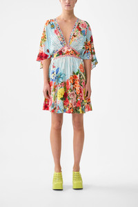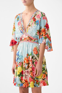 The Papers And Curious Capers Short Waisted Dress is a handcrafted silhouette designed by our in house artisans. Reimagined in an exclusive limited edition print, our short waisted dress falls into an above the knee length with functional pockets and delicate draped sleeves. An open V neckline meets a tapered panelled waist while a shirred back waistband completes the silhouette for comfort. - 100% Silk - V Neck - Shirred Back Waistband - Draped Sleeve - Pockets - Crystal Embellishment SKU 00038756-PAPECAPE-XXS Size and Fit Our model is 5'10 (178cm) tall and wears a size S (AU 10). Bust: 40in (101.6cm) Waist: 26.5in (67cm) Hips: 38in (96.5cm) Designed and fitted true to size, take your normal size. Fabric and Care 100% SILK With its subtly textured surface, silk crepe is our core fabrication made perfect for versatile wear. With its ability to hold alternative ways to wear, this decadent fabric drapes elegantly off the body whilst keeping you cool with its breathable nature.