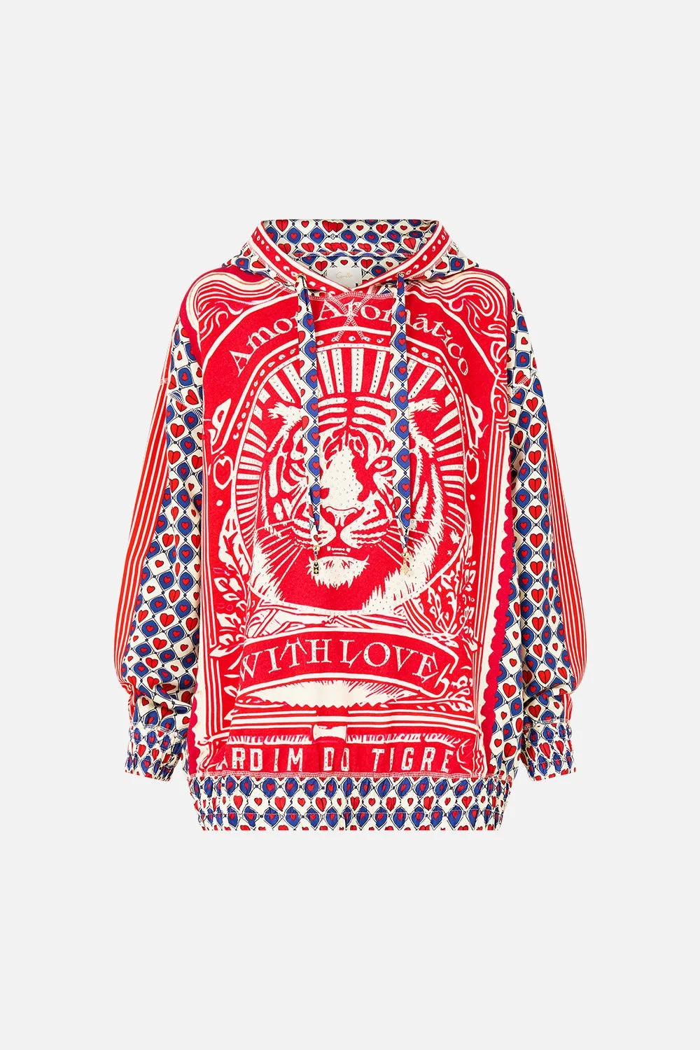 Designed in Australia, the Rinse & Roar Silk Band Oversized Hoodie With Pockets prowls with daring contrasts, tigers emerge amidst red and blue strokes creating a monochromatic masterpiece of wild wonder. Lovingly handcrafted, this luxury hoodie features a generous oversized silhouette with silk-lined detail. Pocket functionality and elastic-encased hem and cuffs showcase decadent wearability. - Oversized Fit - Silk Satin Lined Hoodie, Pockets And Drawstrings - Silk Satin Hem Band And Sleeve Cuff With Encased Elastic - Tassel Charms - Crystal Embellishment SKU 00035549-RINSROAR-XS Size and Fit Designed as an oversized silhouette—take your normal size, or select one size smaller for a neater fit. Fabric and Care SHELL-'100% COTTON , CONST- 100% SILK, LINNING- 100% SILK Organic cotton is breathable, lightweight fabric. With a natural texture, it holds its shape gracefully and is perfect for soft, everyday silhouettes.