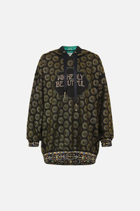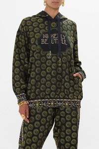 Designed in Australia, The Defy Gravity Silk Band Oversized Hoodie With Pockets beckons you to the decadently enchanted land of Oz, where opulent gold embellishments and extravagant borders cascade through a bewitching realm, intertwining with dazzling greens and teals. Lovingly handcrafted, this luxury hoodie features illuminating glow in the dark contents and a generous oversized silhouette with silk-lined detail. Pocket functionality and elastic-encased hem and cuffs showcase decadent wearability. - Oversized Fit - Glow In The Dark Feature - Silk Satin Lined Hoodie, Pockets And Drawstrings - Silk Satin Hem Band And Sleeve Cuff With Encased Elastic - Tassel Detail - Crystal Embellishment SKU 00036353-ELPHABAJ-XS Size and Fit Our model wears a CAMILLA S and is 5'10 (178cm) tall. Her standard dress size is an AU 10. She has a 32in (83cm) bust, 35in (89.5cm) hips and a 25in (66cm) waist. Camilla S = AU10 / UK10 / US6 Designed as an oversized fit. Take your normal size or select one size smaller for a neater fit. Fabric and Care 100% COTTON