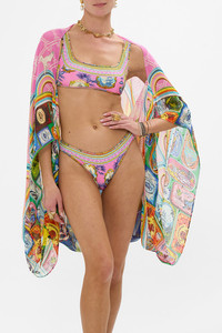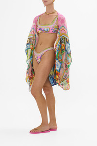 Designed in Australia, The Salty Splendour Silk Shrug vibrantly expresses the vibrant ocean energy that mirrors Lisbon's Saint Anthony Festival, alive with music, laughter, and summer's fresh flavours. Lovingly handcrafted, this luxury silk shrug features a generously relaxed fit throughout the body that flows into wide draped sleeves. With an open neckline and a beautiful billow, this silk layer offers perfect coverage over swim or evening dresses. - Printed CAMILLA - Crystal Amulet Embellishment - Wide Arm Holes For Relaxed Fit SKU 00034213-SALTSPLD-O/S Fabric and Care MAIN: 100% SILK