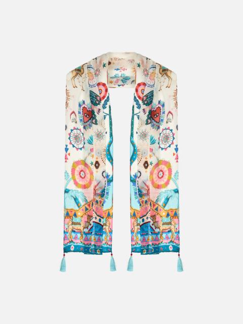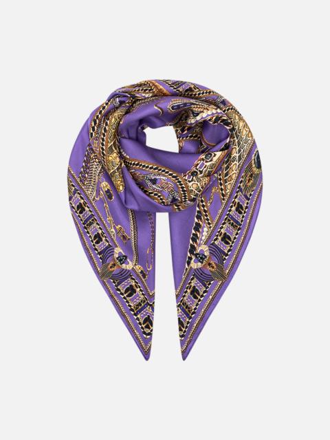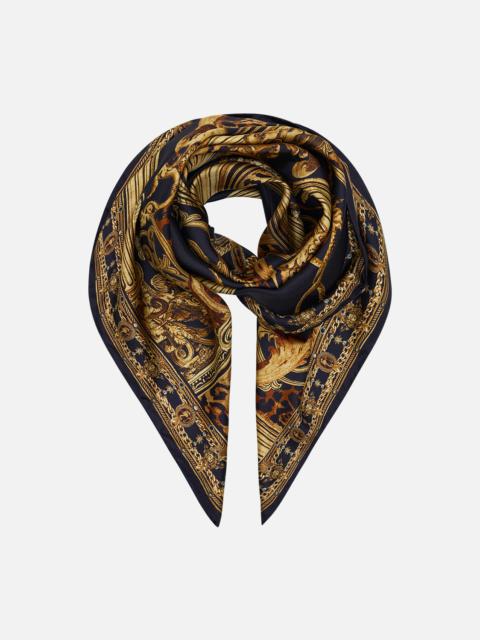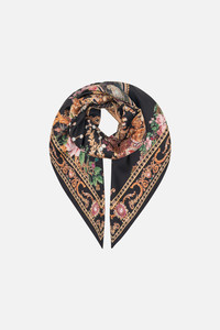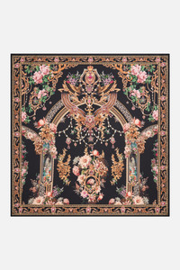 The Dynasty Daze Silk Square Scarf is an immersion into an opulent world of rich black adorned with delicate florals and decorative golden fronds. This luxury silk scarf features custom border details entwined with a bespoke CAMILLA print. The hand rolled hemline and generous expanse allows for chic multi wear versatility. Explore more from the House Of The Sun collection. - Lovingly Handcrafted - Designed in Australia - CAMILLA Accessories - Hand rolled hems - Printed silk - Contrast border - 95cm x 95cm SKU 00032814-DYNADAZE-O/S Size and Fit Our model wears a CAMILLA O/S and is 5'10 (178cm) tall. Her standard dress size is an AU 10. She has a 32in (83cm) bust, 35in (89.5cm) hips and a 25in (66cm) waist. " - One size style. " Fabric and Care MAIN: 100% SILK Silk twill is renowned for its diagonally-patterned weave and fluid texture. Its high thread count ensures rich density and durability, while its beautiful sheen provides a luscious touch to the skin.