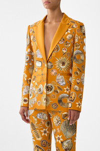 The Talismans Of Turkiye Single Breasted Peak Collar Blazer is a handcrafted silhouette designed by our in house artisans. Reimagined in an exclusive limited edition print, this single breasted blazer is tailored and fully lined. It features custom designed CAMILLA buttons and is elevated with a beautiful lapel collar for effortless wear. - Lapel Collar - Single Breasted - Tailored Fit - Fully Lined - Custom Designed Buttons - Stretch Suiting SKU 00038219-TALITURK-XS Size and Fit Our model is 5'10 (178cm) tall and wears a size S (AU 10). Bust: 40in (101.6cm) Waist: 26.5in (67cm) Hips: 38in (96.5cm) Fabric and Care 97% VISCOSE 3% ELASTANE Viscose is a fibre crafted from the natural substance, cellulose, known for its softness, breathability and drape. It possesses a subtle sheen and is perfect for lightweight soft tailored silhouettes or more structured styles in heavier weights.