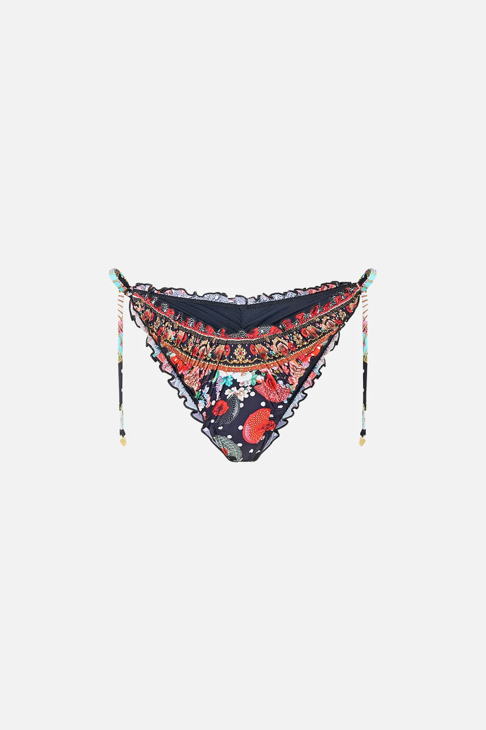The Daughters Of Duende Skimpy Bikini Bottom W Ruched Edges is a handcrafted silhouette designed by our in house artisans. Reimagined in an exclusive limited edition print, this ruched bikini bottom honours the feminine form with a high leg line that meets a dipped waist. Finished with meticulously placed crystal embellishment, side ties adjust for a flattering yet barely there fit. - Skimpy Bottom Coverage - Side Ties With Charm Trim Detail - Dipped Waist - High Leg - Ruched Edges - Crystal Embellishment SKU 00040824-DAUGDUEN-XS Size and Fit Our model is 5'10 (178cm) tall and wears a size S (AU 10). Bust: 40in (101.6cm) Waist: 26.5in (67cm) Hips: 38in (96.5cm) Fabric and Care 80% RECYCLED POLYAMIDE 20% ELASTANE