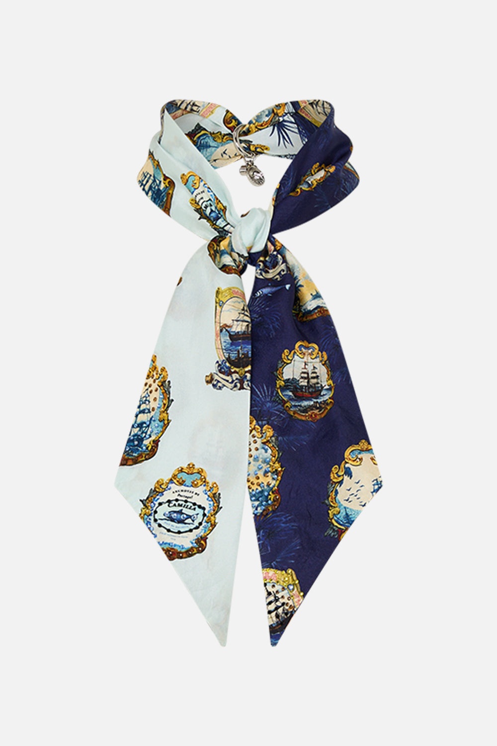 Designed in Australia, The Song Of Saint Anthony Skinny Neck Scarf With Trinket embarks on a fishing trip through Lisbon’s coastal charm, where hand-drawn creatures embody the spirit of the Saint Anthony Festival—oceanic and celebratory. Lovingly handcrafted, this silk skinny neck scarf is adorned with a crystal charm trinket, exuding timeless luxury with every delicate fold. - CAMILLA Printed Silk - Crystals - Charm Trinket SKU 00034269-SONGANTH-O/S Fabric and Care MAIN: 100% SILK Silk twill is renowned for its diagonally-patterned weave and fluid texture. Its high thread count ensures rich density and durability, while its beautiful sheen provides a luscious touch to the skin.