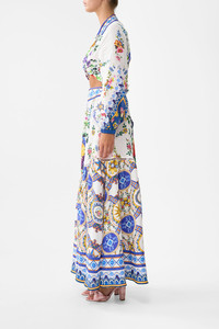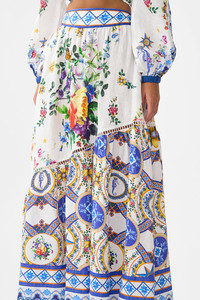 Designed in Australia, the Tiles Darls Skirt With Shaped Seam reads the language of florals and tiles, blue and orange hues intertwine, a celebration of artisan hands and enduring beauty. Lovingly handcrafted, this luxury maxi skirt features a softly gathered full skirt with a unique asymmetrical tiered seam that creates an exquisite flare that falls to a full-length hemline. With an elastic encased adjustable back and side seam pockets, it showcases decadent details. - Maxi Length - Curved Asymmetrical Seam - Shirred Back Waist - Shaped Front Waistband SKU 00034873-TILEDARL-XS Size and Fit Designed and fitted true to size, take your normal size. Fabric and Care 100% LINEN Made from flax fibres, this lightweight natural fibre offers a timeless aesthetic that adds durability and longevity to any wardrobe. Its breathability keeps your skin cool, minimises moisture and ensures effortless comfort.