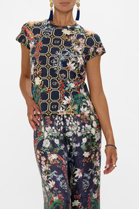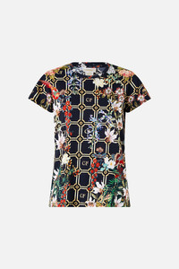 Designed in Australia, The Palacio Poetry Slim Fit Round Neck T-Shirt - Multi unveils an oasis where cranes soar among lush ferns, intricate tilework, and dreamlike ceramics—a soft navy sanctuary, each detail whispering stories of wonder. Lovingly handcrafted, this luxurious graphic t shirt features a slim fit throughout the body that falls to a hip length hemline. The lush short sleeves echo the slim silhouette adding a feminine element to this elevated staple piece. - Slim Fit T-Shirt - Rib Neckline Bind - Placement Print - Crystal Embellishment - Non-Sheer SKU 00034034-PLCIPOET-XXS Size and Fit Designed as a slim fit, take your normal size Fabric and Care 100% COTTON
