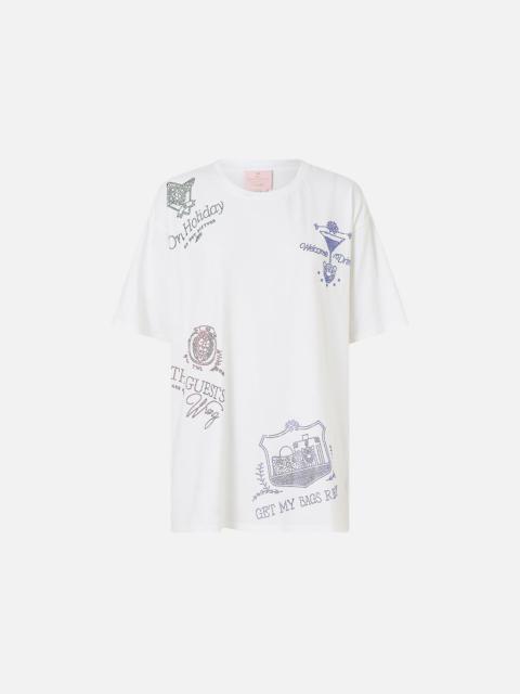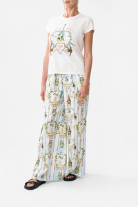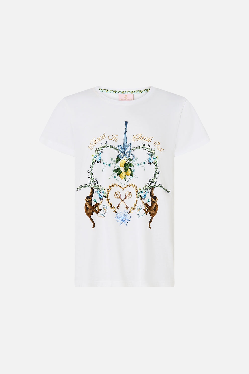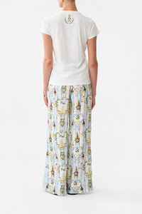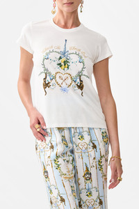 Designed in Australia, The Venus On A Vespa Slim Fit Round Neck T-Shirt exudes placid blue skies amid ornate archways and gilded borders, a collection reimagining intricate illustrations by Lezio Lopez. Lovingly handcrafted, this luxurious graphic t shirt features a slim fit throughout the body that falls to a hip length hemline. The lush short sleeves echo the slim silhouette adding a feminine element to this elevated staple piece. - Slim Fit T-Shirt - Round Neckline - Rib Neckline Bind - Crystal Embellishment SKU 00037988-SICILYSL-XXS Size and Fit Designed as a slim fit, take your normal size Fabric and Care SHELL- 100% COTTON, CONST- 96% COTTON 4% ELASTANE