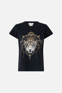 The Feline Folklore Slim Fit Round Neck T-Shirt - Black is a handcrafted silhouette designed by our in house artisans. Reimagined in an exclusive limited edition print, this slim fit t shirt is adorned with intricately placed crystal embellishment before being finished with a rounded neckline complete with ribbed detailing. - 100% Organic Cotton - Slim Fit T-Shirt - Round Neckline - Rib Neckline Bind - Crystal Embellishment - Applique Silk Patch - Gots Organic Cotton Main Fabric SKU 00039045-FELIFOLK-XXS Size and Fit Our model is 5'10 (178cm) tall and wears a size S (AU 10). Bust: 40in (101.6cm) Waist: 26.5in (67cm) Hips: 38in (96.5cm) Designed as a slim fit, take your normal size. Fabric and Care SHELL-100% COTTON, CONTRAST-96% COTTON 4% ELASTANE Organic cotton is breathable, lightweight fabric. With a natural texture, it holds its shape gracefully and is perfect for soft, everyday silhouettes.