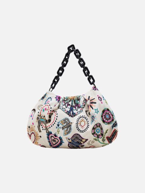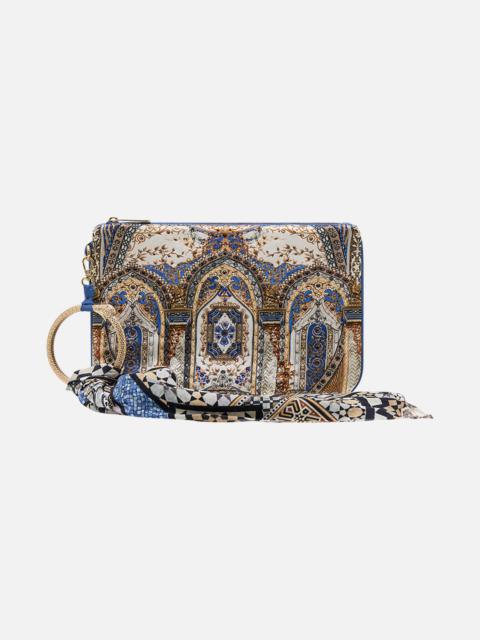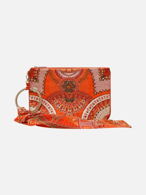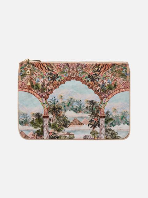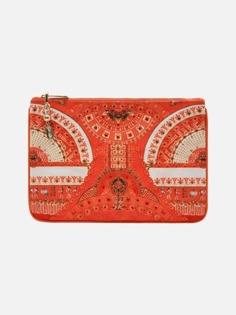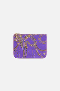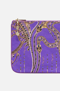 Designed in Australia, The Luxorland Lady Small Canvas Clutch is a fusion of symbolic adornments and Egyptian revival, featuring an ornate blend of purple, gold, and metallic imbued with serpent and jewel detail. Lovingly handcrafted, this CAMILLA clutch bag showcases a streamlined rectangle silhouette adorned with contrast piped edges, a zip top enclosure, and finished with a custom made parrot clip. The internal pocket and generous main compartment keep your treasures stored in style. - Crystal Embellishment - Tassel With Parrot Clip - Internal Pocket - Contrast Piped Edge - 26cm x 18.5cm SKU 00032356-LUXOLADY-O/S Size and Fit Our model wears a CAMILLA O/S and is 5'10 (178cm) tall. Her standard dress size is an AU 10. She has a 32in (83cm) bust, 35in (89.5cm) hips and a 25in (66cm) waist. Fabric and Care MAIN: 100% POLYESTER